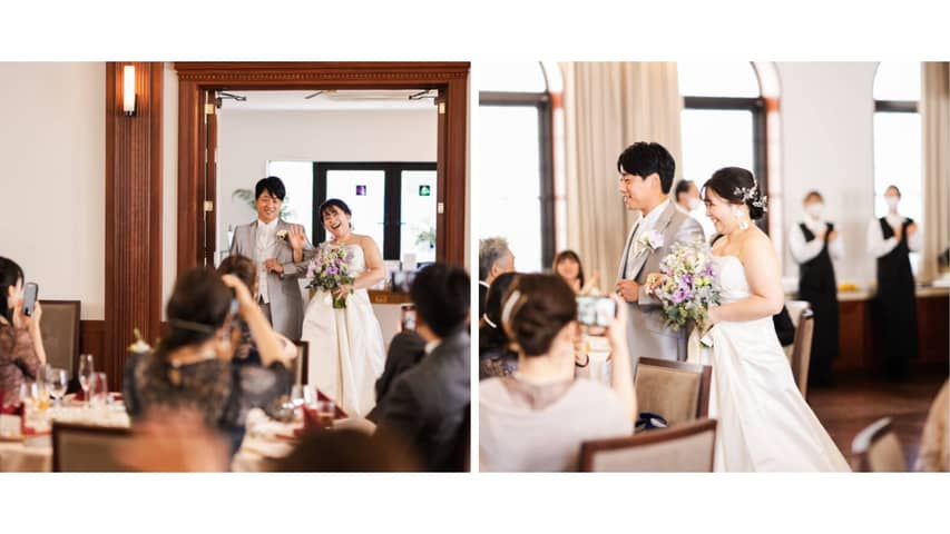 「見学のときからスタッフの方々のあたたかく和やかな雰囲気が、素敵だなと思ったことが1番の決め手です!」と仰ってくださるおふたり。ゲストの皆さんと写真を撮る時間を長くとったり、お料理にこだわってくださったりと、ゲスト想いな“おふたりらしさ”が随所に感じられる結婚式になりました。