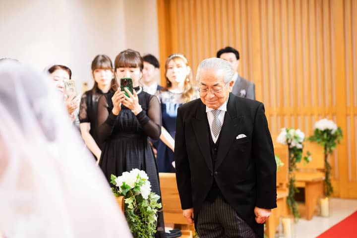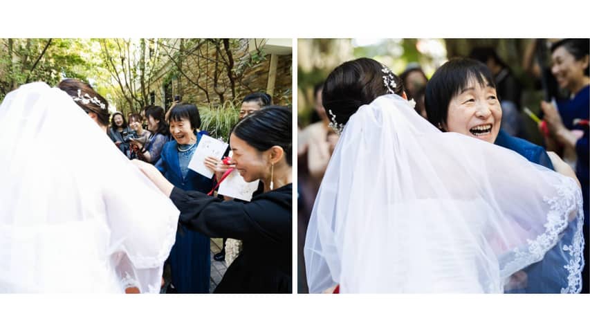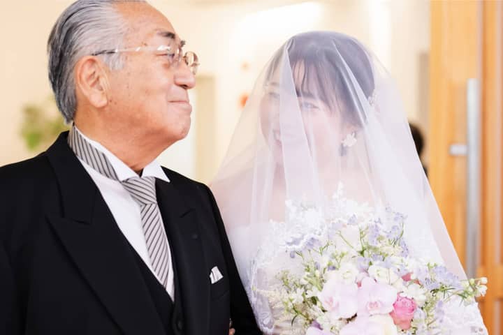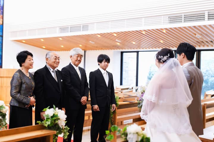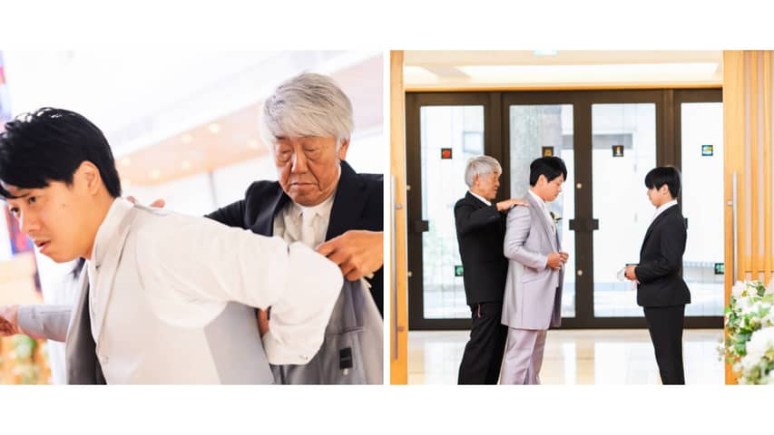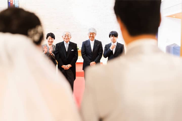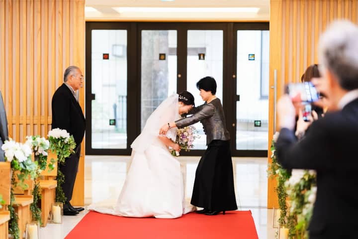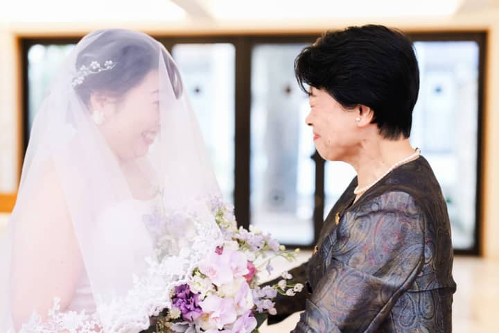 新郎様のご入場時にはジャケットセレモニーを、新婦様のご入場時にはベールダウンを。それぞれご家族の方にお手伝いをいただきました。親御様からの最後の身支度、ともいわれるこちらの演出。親御様は、いってらっしゃい、の気持ちを込めて、おふたりを見送られます。