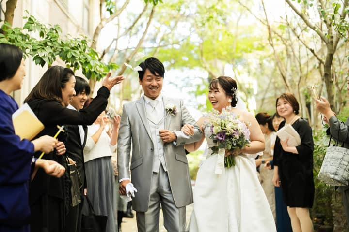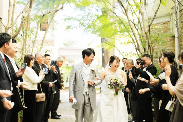 挙式後は木漏れ日の中で行うフラワーシャワー。