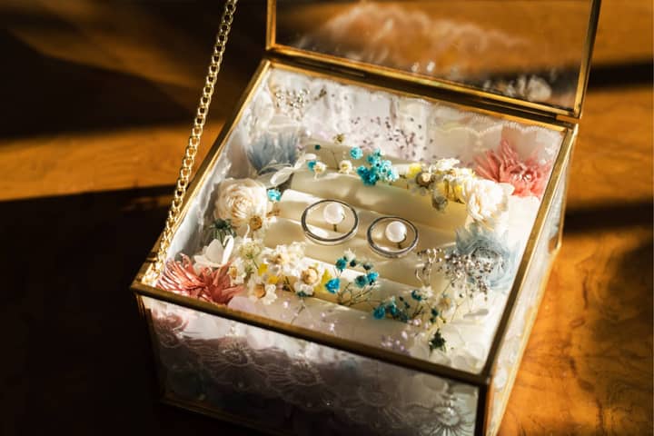「リングピローは以前いただいたカスミソウをドライフラワーにして入れました」と。