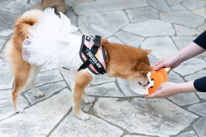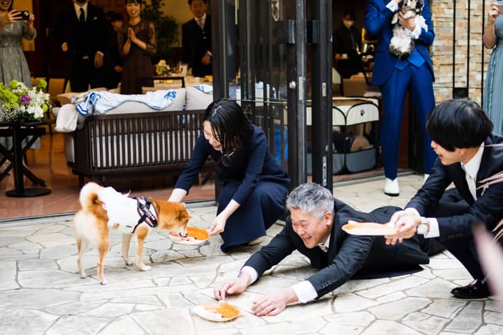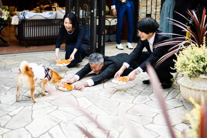 ゲスト参加型の演出をと、おふたりが考えてくださったのは、「誰のおやつを食べるかなゲーム」!プライベートテラスで、みなさんにおやつを持ってもらって、ワンちゃんは誰のおやつを食べるのか、ゲームで楽しんでいただきました。