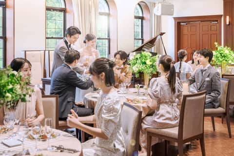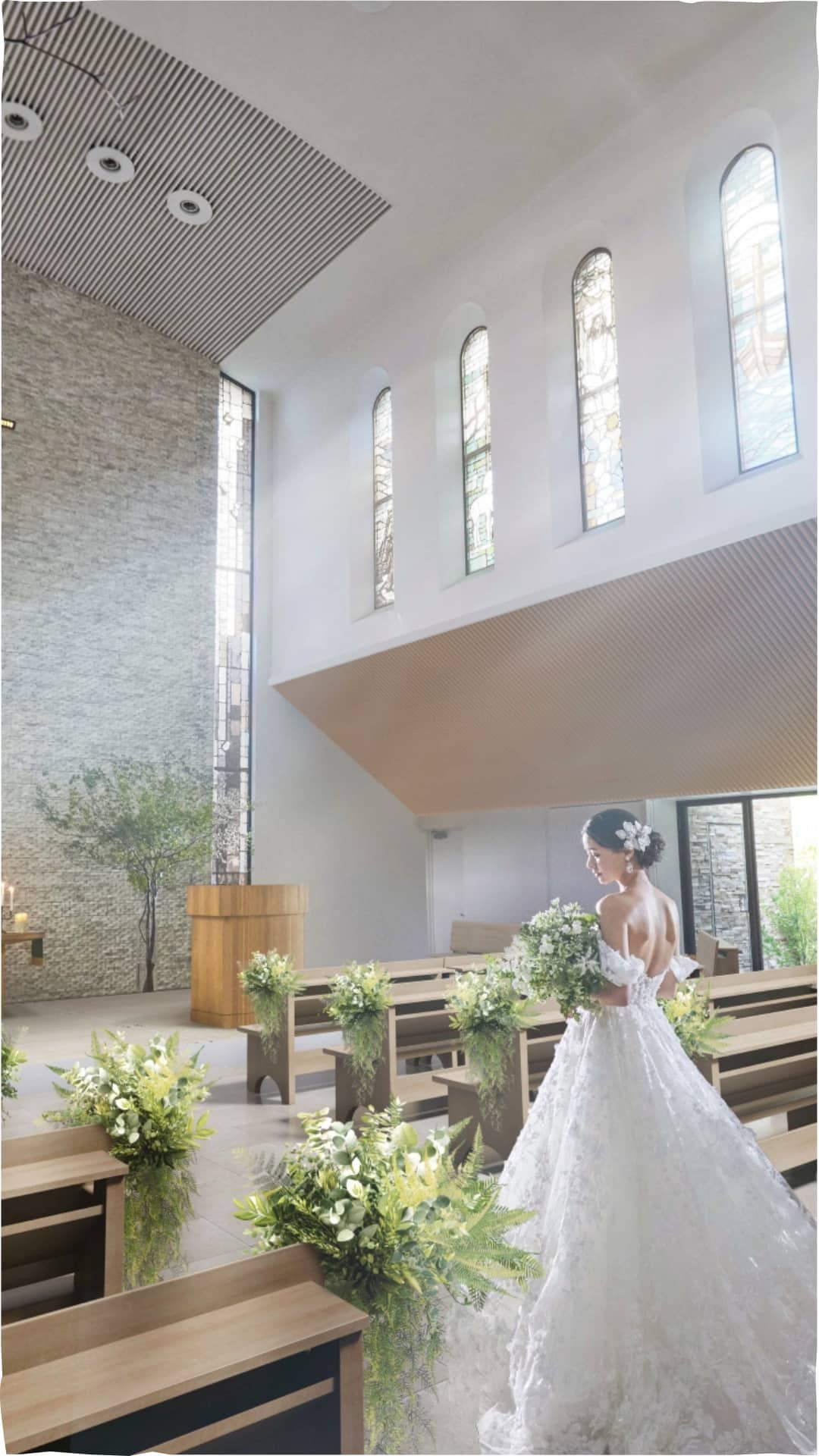 たいせつな門出となる挙式では、おふたりやご家族、ゲストの皆様の心に残る感動の挙式を執り行っていただきます。本物の牧師先生が司式者を務める本格的な挙式では、ステンドグラスや大理石に陽光が差し込み、感動と笑顔が溢れるやさしい結婚式を叶えていただけます。
