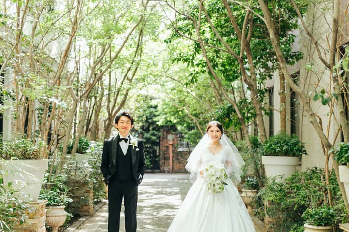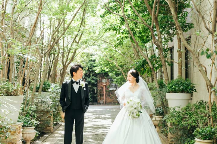 組数限定のメーヤー・ライニンガーは、結婚式当日にたくさんおふたりでの写真が撮れるのがポイント。緑に包まれる空間が純白のドレスをより引き立てます。