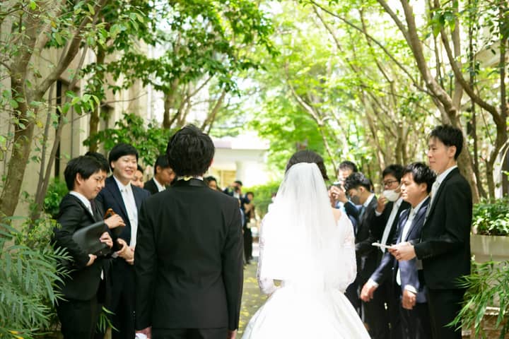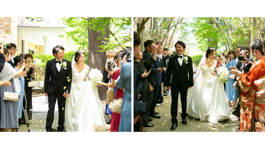 全員で集合写真を撮ったあとは、緑のトンネルの中行う、【フラワーシャワー】。祝福の言葉に包まれる幸せな空間です。
