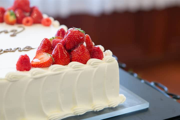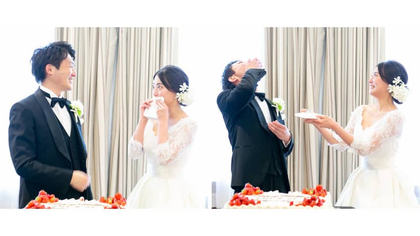 ケーキ入刀とファーストバイトの演出もほっこり。皆さんの表情から、おふたりのお人柄が浮かびますね。