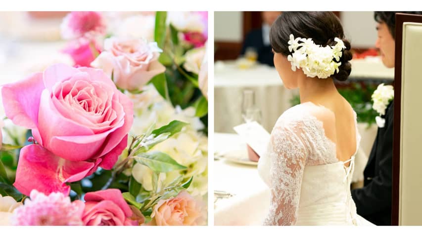 「会場やドレスの雰囲気に合うように、こだわったフラワーコーディネート」は、「何度かフローリストと打合せをさせていただき、想いをカタチにすることができました」と。ブーケやコーディネートがとても素敵でゲストの方もたくさんお写真を撮られていました。